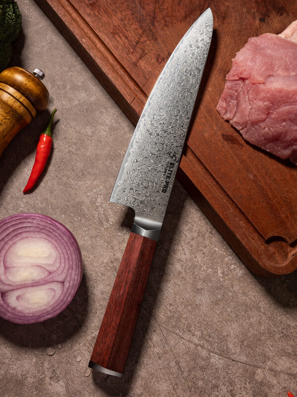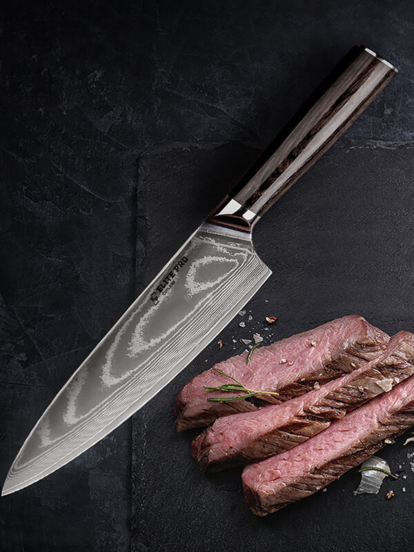 ELITE PRO CUTLERY 8″ Chef Knife (DCK-LF) made with 73 layers Damascus steel, designed for versatile slicing tasks.